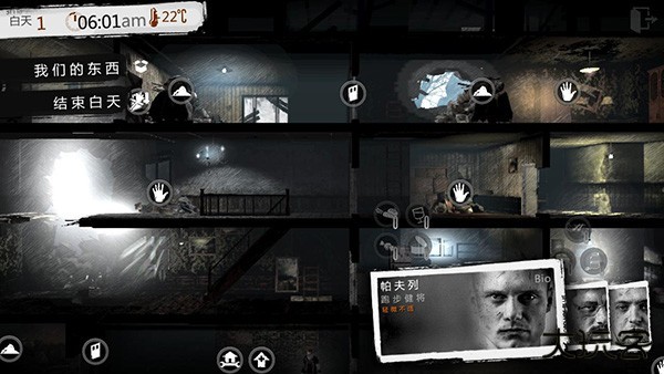 白天大部分地区都处于交战状态,游戏设定白天外出街道上有狙击手(哪管好的坏的=_=,看见会动的就打)所以玩家操纵的角色在白天只能呆在家里活动,这段时间玩家可以操纵角色修复避难所的破洞增强防御,也可以搭建更多的设施,疲劳的角色也可以在这段时间休息。其他幸存者也有几率拜访交易或者寻求帮助,玩家可以与他们交易或者帮助他们(帮助他们有几率让出去帮助的那个角色受伤)。