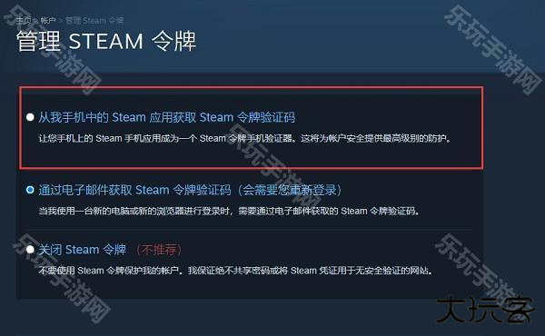 3、进入管理steam令牌界面,勾选从我手机中的steam应用获得令牌认证码。