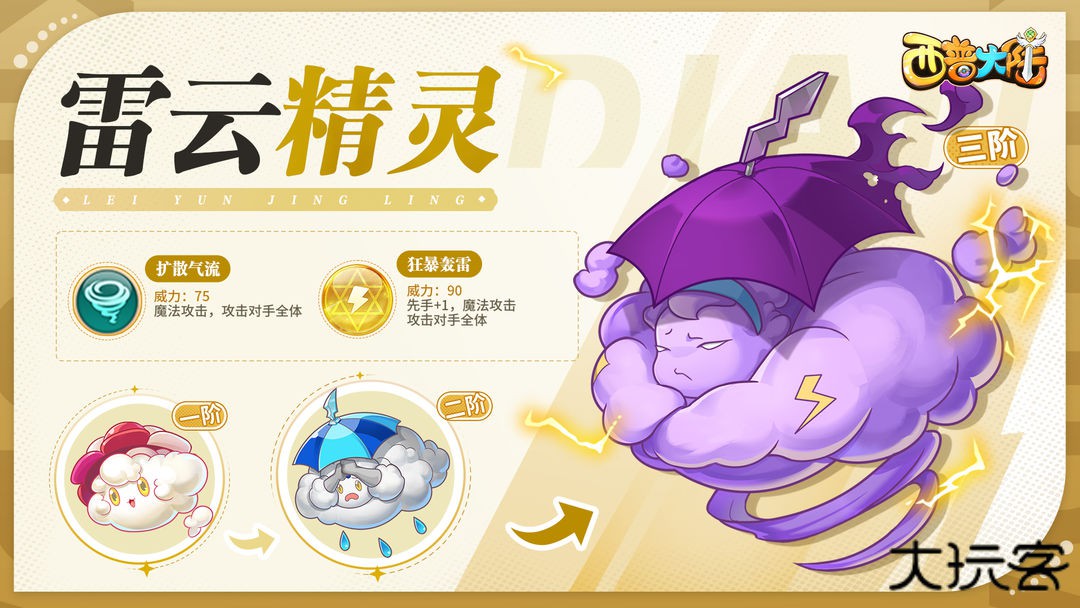 云类精灵有三种分支。最喜欢在晴朗天气里出没的云精灵。她有着蓬松柔软的云絮,头顶上的太阳帽是花朵形状的,显得十分活泼俏皮。云精灵性格就像她的外形一样,当你想要拥抱她时,她会温柔地回应你。在天气晴朗的日子里,云精灵努力给人们带来好心情。雨云精灵则十分容易焦虑和紧张,每当她感到紧张时,身体里的水分会凝结成水滴,最终汇聚成一场雨。这也是她被称为雨云精灵的原因。虽然她十分胆小,但她看到万物在雨水的帮助下生长的场景时,会在无人注意的角落里偷笑。而第三分支雷云精灵看起来总是不太开心。他壮硕的手臂总是习惯性地抱在胸前。皱眉抱臂的样子,更让人觉得不好惹。因其自带的生人勿进气场,少有人了解他的过往。睡着的时候会发出震天响的鼾声是他名声远扬的另一个特色。