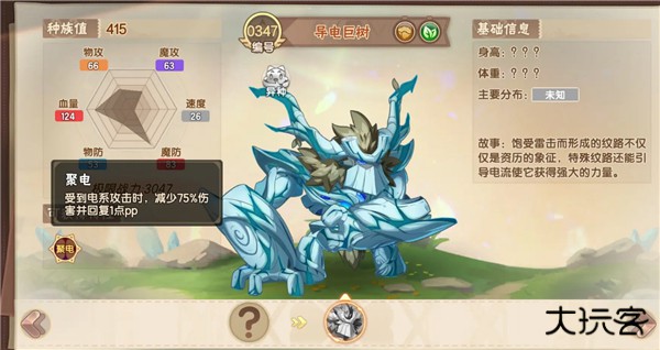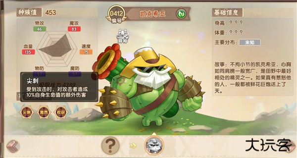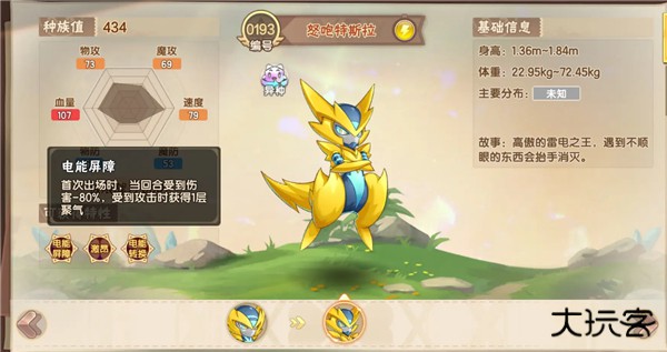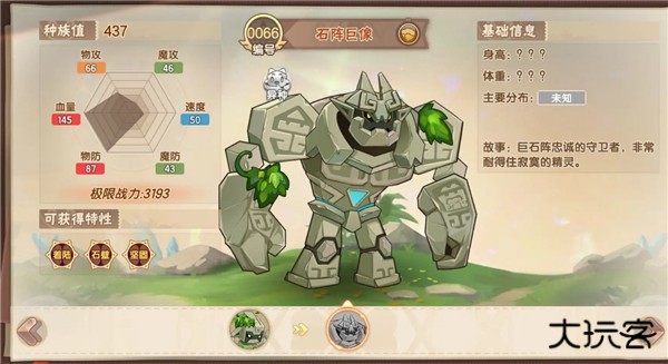 3、石阵巨像——没啥用(玩具),可能用于针对弱地高攻精灵,满血满物防种族值,小技能血量决定伤害,大招物防决定伤害