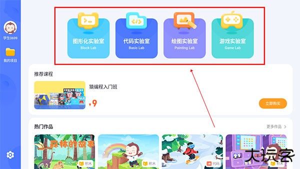 1、下载进入猿编程HDapp,进入首页,在上方有多种编程实验室;