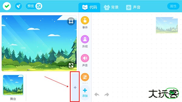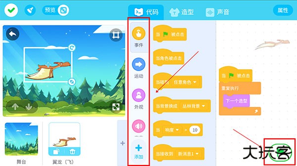 5、在代码下,选择不同的代码板块对主体产生一系列的动画效果,点击右下角即可运行;