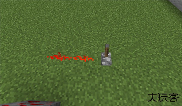 第一个方块为开关,开关有两种状态,一般把手向上为关闭,向下为开启,开启状态下的开关可以为红石线路提供满格的信号。