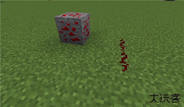 左边的矿物是红石矿,开采后可以获得数个红石,红石放置在地上之后就会形成红石线路。要注意的是,红石矿在开采的时候会出现自然发亮现象,不必惊慌,我们开采红石矿的工具至少为铁质的。