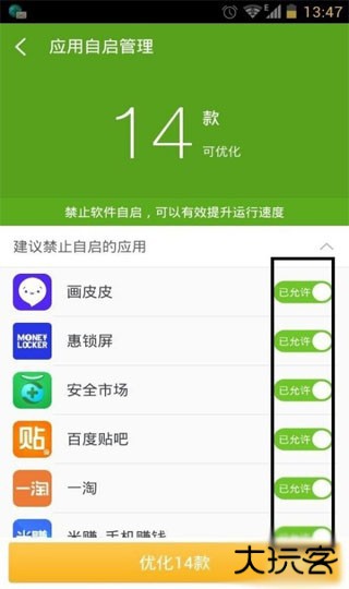 然后就会显示所有已经默认后台自启动的软件。可以看到这里有14款软件开机自启动,手机卡顿在所难免!
