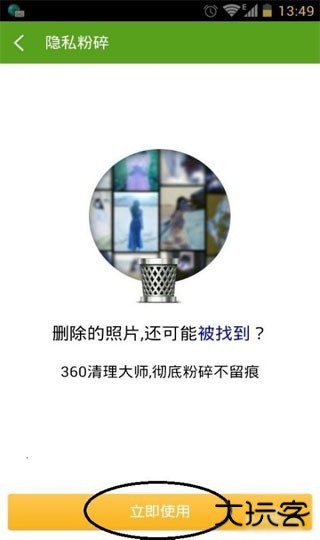 点击【立即使用】就会开始下载360清理大师——最强力手机清理神器。当你用360清理大师清理手机后,能够防止删除的照片恢复。