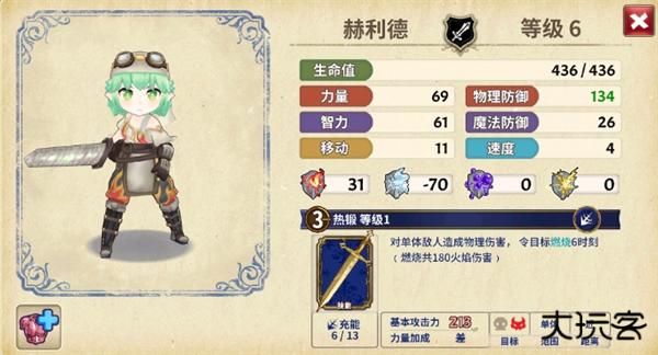 基础信息:等级 6,生命值 /436,力量 69,物理防御 134,智力 61,魔法防御 26,移动数值 11,速度 4。【可随着等级的提升而增加】