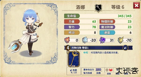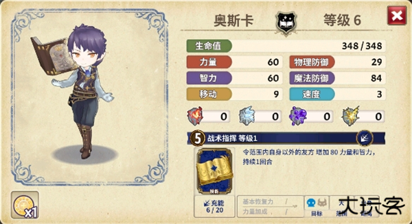 基础信息:等级6,生命值当前为 /348 ,力量和智力均为60,物理防御29,魔法防御84,移动数值9,速度3。【可随着等级的提升而增加】