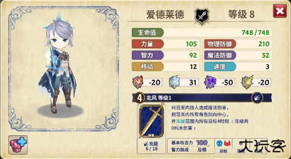 技能特点:拥有技能 “北风”(等级 1),消耗 4 点能量,能对范围内敌人造成魔法伤害,把范围内所有角色拉向中心,并在范围内四角出现 4 道冰刺(冻结共 0 纯水伤害)。从属性上看,爱德莱德力量和物理防御较高,可在战斗中承担一定的近战输出和前排承伤角色,技能 “北风” 具备控制和伤害能力,能聚拢敌人并造成伤害,在团队战斗中可配合队友打出更多输出。