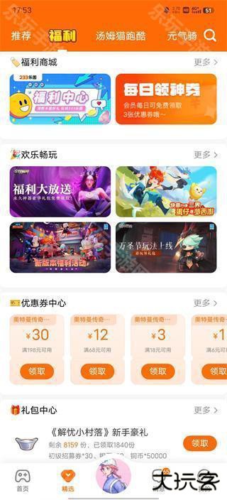 5、在【福利】专区能够获取游戏道具、折扣券等福利,大家可以去看看领对应游戏的礼包哦。