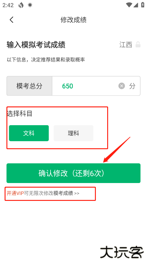 2、然后在修改成绩的页面可以看到科目的选择,改为你想要的科目点击确认修改即可。注意免费修改机会只有6次,但是开通vip可无限次修改科目和模拟考成绩。