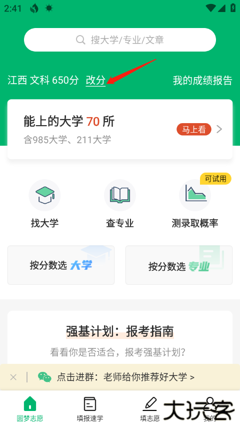 1、首先在本站下载安装该app并打开登录,进入圆梦志愿页面后点击搜索框下方的改分。