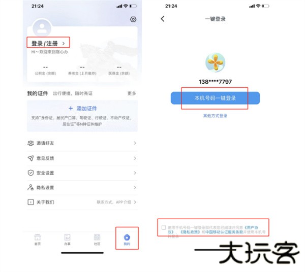 1、打开宿心办app,点击【我的】-【登录】,使用本机号码一键登录。