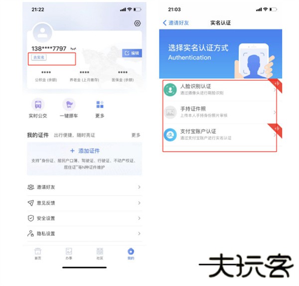 2、登录成功后,点击【我的】点-【去实名】,选择任一方式进行实名认证。