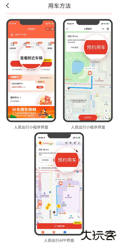在线下或打开人民出行小程序、人民出行APP,找到附近可用车辆,点击车辆查看可骑行里程及价格,并可预约用车 (最多保留10分钟)。