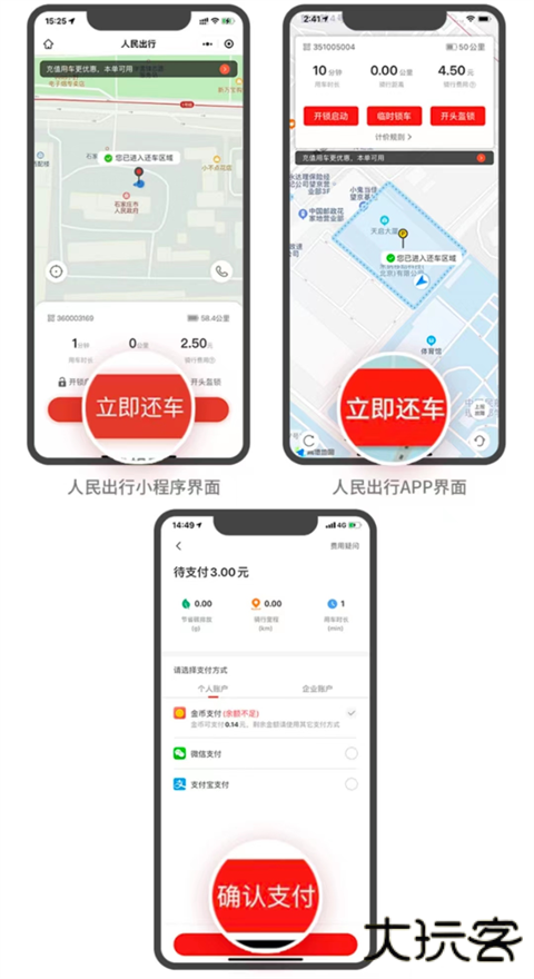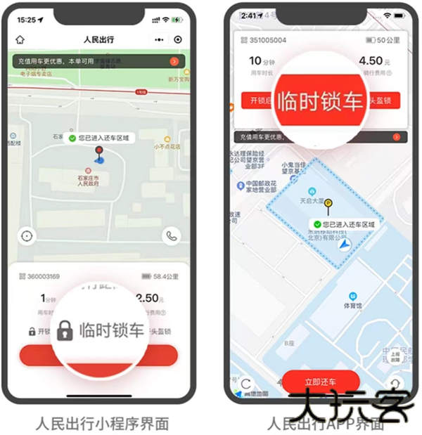 确认到达服务区内停车点,点击“立即还车”,进行支付;若不在规定的停车点/区域,将收取调度费。