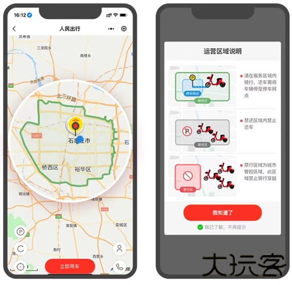 开锁后在运营区域内骑行:地图显示的绿色阴影区域是服务区,骑出服务区域车辆会自动断电,且会收取一定的调度费用。