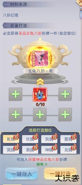 八卦牌可以通过打造提升品级,任意5件低品级的同类八卦牌即可打造一件高品级八卦牌。低阶打造只消耗八卦牌,高级打造需要消耗指定道具升星石。八卦牌分解与八卦牌部位无关,只与八卦牌类别以及品级有关。