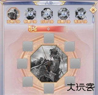玩家的八卦根据飞升境界进行开启,依次为玄龟八卦、惊雷八卦、白泽八卦、炎凰八卦、苍龙八卦。八卦部位装备八卦牌之后即可使用强化石对不同部位进行强化,只有装备了八卦牌的部位才能进行强化,强化后增加的属性直接添加到主角人物身上。