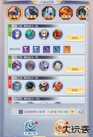 (1)玩家可以前往八卦幻境获取八卦,八卦幻境分为5个境界,每个境界需要对应的八卦开启后才能同步开,而每个境界共分5层,1、2两层为和平层,3至5层为混乱层,会受到其他玩家攻击。