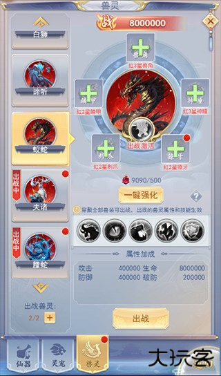 在游戏界面下角的仙灵系统中会有一个收集“兽灵”的系统分支,那里沉睡着山海经中的各种神兽,玩家必须通过集全兽角、神瞳、獠牙、利爪、鳞甲这五种兽灵装备才能使兽灵出战。