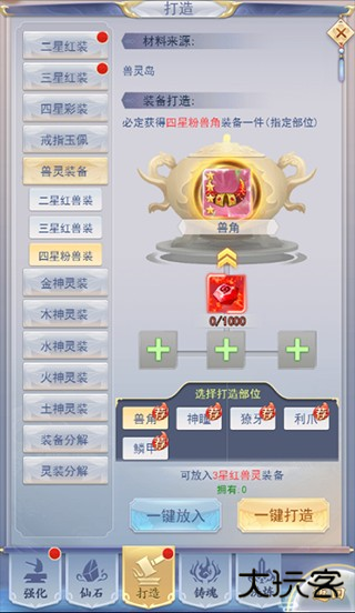 兽角除了可以通过击败灵兽岛上的神兽获得之外,还能像其余四件灵兽装备一样,消耗兽源石打造而成。