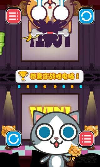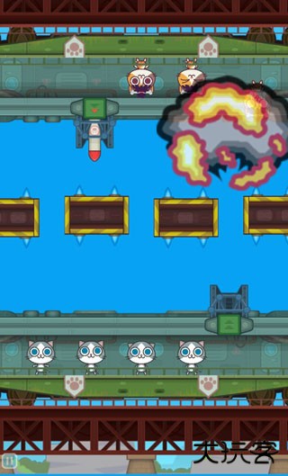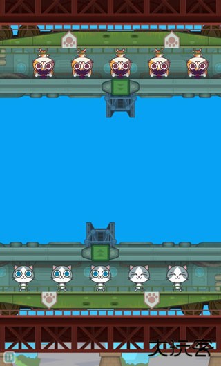 游戏中的主角是非常可爱的喵星人,它们有着大大的眼睛,整个脑袋比身体还大,很明显的夸张类卡通绘画方式。游戏采用了相对反向的画面呈现,我们的屏幕分为两个区域,上下各为不同的区域,相互反向,这样刚好两个人就能对面而坐。游戏画面风格非常清新秀气,再加上可爱的喵星人会有各种不同的表情,让残酷的挑战也变得充满了搞怪的趣味。