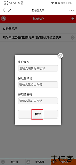 5、设置参赛昵称,添加保证金监控中心账号密码(可添加多个保证金账户)。