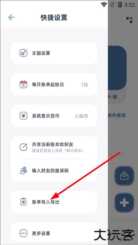 2、打开快捷设置页面,有主题设置、每月账单起始日、系统显示货币等,下拉点击账单导入导出;