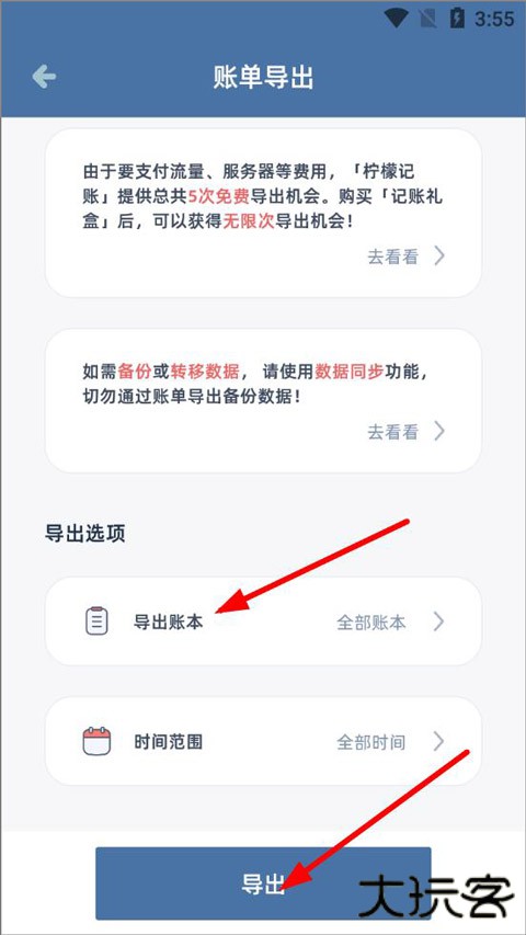 4、打开账单导出页面,导出选项有导出账本、时间范围,点击导出账本,选择默认账本或已添加的账本,选择后点击下方导出即可下载记录数据。