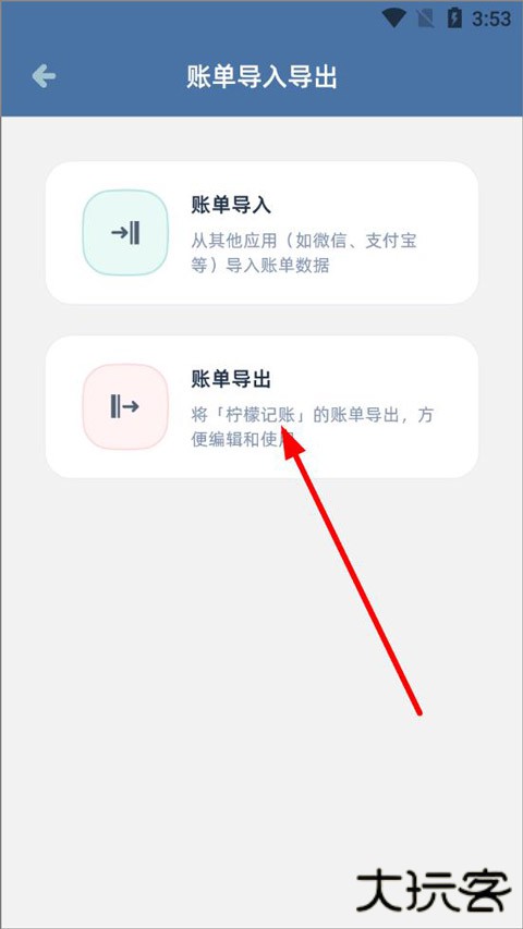 3、进入账单导入导出页面,用户可以选择从其他应用导入账单数据,也可将软件记录的数据导出;
