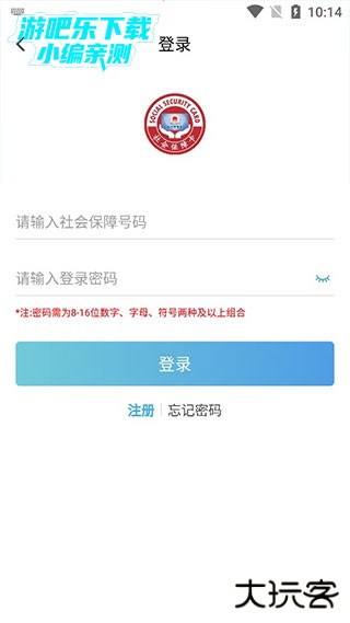 2、输入社保卡号码(一般是身份证号码)以及登录密码,如果首次使用,可以点击注册,进行人脸识别设置密码;