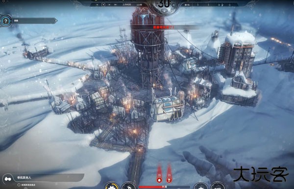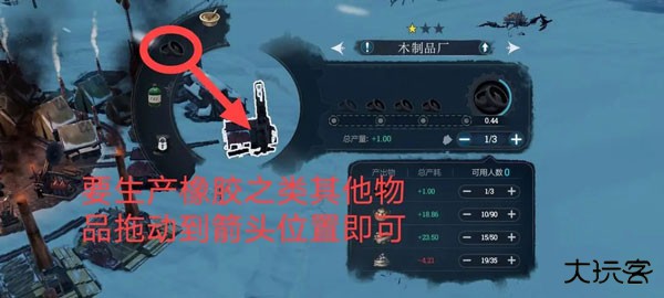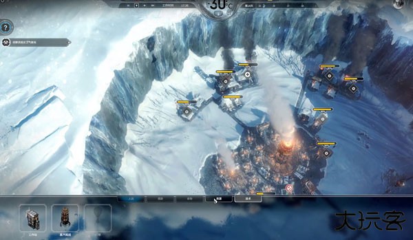 注意锤子图标旁的箭头所示的道路图标,在雪地中修建道路可以让工人更快的赶到工作地点。