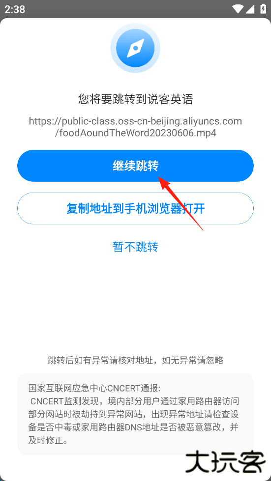 6、点击“继续跳转”或者“复制地址到手机浏览器打开”都是可行的。