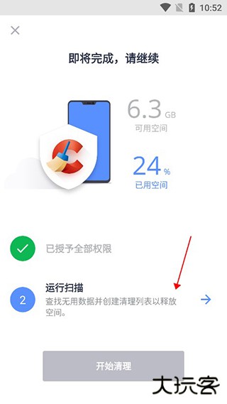 3、授权完毕,点击运行扫描,开始清理手机中的各种垃圾文件;