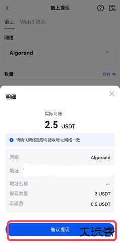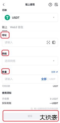 步骤三:选择提现网络,请务必选择与您的接收地址相匹配的区块链网络(例如:USDTTRC20或USDTERC20)。如果网络不一致,您的提现将无法到账,资产无法找回。然后输入接收地址和提现数量,然后点击“提现”。