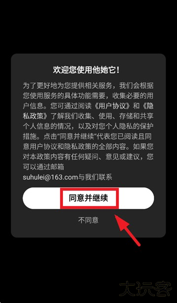 1、下载安装并打开他她它app,在欢迎您使用他她它!提示界面选择同意并继续