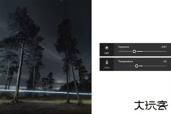 降低曝光度和温度以创建黑暗、凉爽的场景。