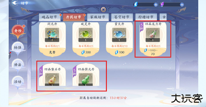 丹药坊市的打折丹药,建议全部购买,是一种快速提升修炼境界和属性的高性价比方式。