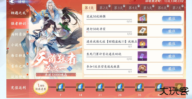 完成新手7日任务,可以帮助阁下快速熟悉游戏内容。任务简单且奖励丰厚,完成所有任务即可获得天阶角色五选一!