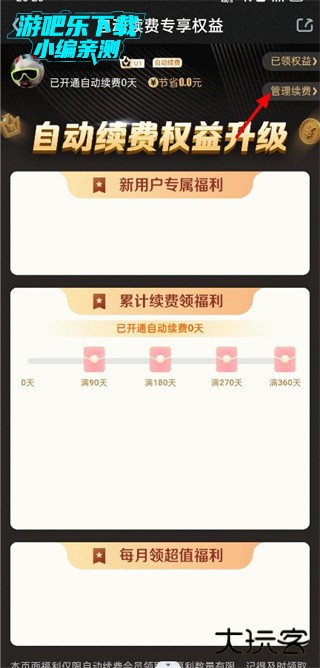 2、进入自动续费专享权益页面点击管理功能。