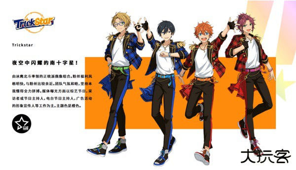 Trickstar由衣更真绪、游木真、明星昴流、冰鹰北斗四位美少年组成,他们性格各异,但是都在舞台上散发着别具一格的魅力!就让这四位美少年和你一起享受音乐演艺的生活吧!