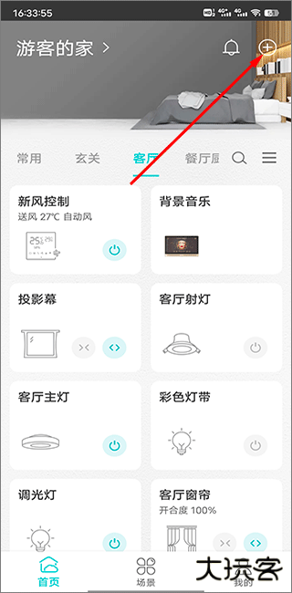 1、开启客厅照明,支持点击常用设备中的客厅照明开关并开启照明;