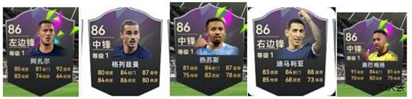 那前锋的话,射门这项都普遍较高,如果你想要数值都比较均衡的话,可以选阿扎尔、迪玛利亚;如果想打双中锋,可以选奥巴梅杨(美羊羊)、格子、热苏斯搭配签到7天送的伊布;想打三前锋阵型可以基耶萨+阿扎尔+前面选的红卡中锋;搭配你的进攻三叉戟组合。