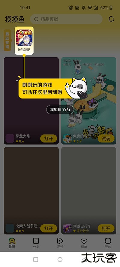 4、重新启动摸摸鱼,会显示最近的游戏在哪里,我们点击知道了。