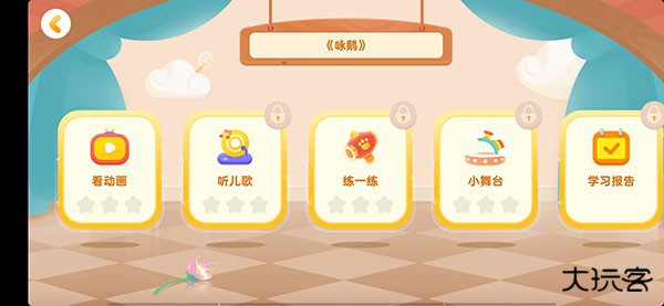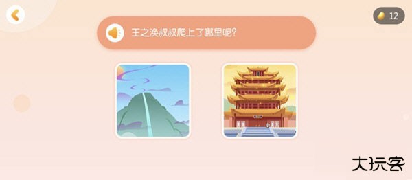 5、在app中,每一个古诗学习课程中都需要先通过“看故事”“听儿歌”后才能解锁“练一练”。同时,在练一练模式中,小朋友们需要根据之前学过的内容里回答古诗词问题,答对了即可获取金豆。