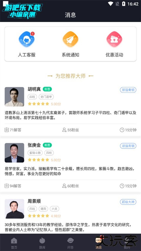 4、进入消息板块,这里有系统为大家推荐的大师,有任何问题都可以在线咨询;