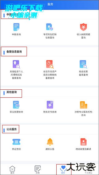 打开软件,就可以看见我要办税、我要查询、公众服务等功能特色。