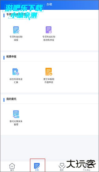三大功能要素,其中包括专项附加扣除填报、税费申报、我的委托等。