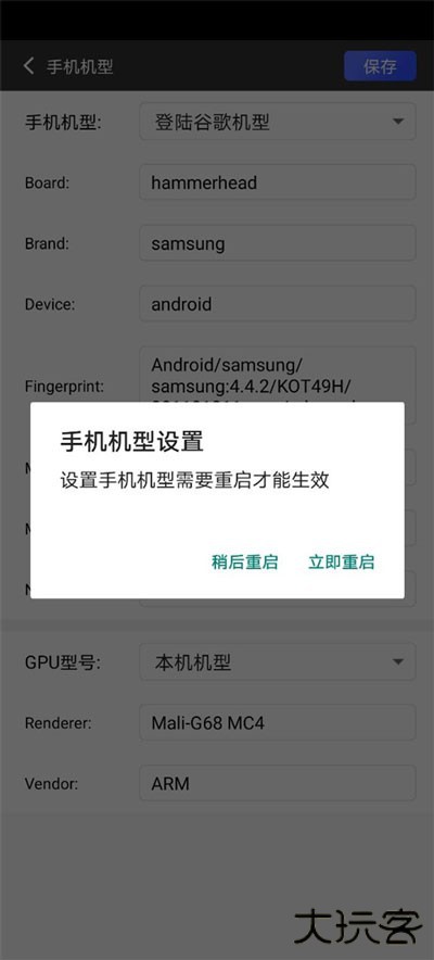 4、在手机机型中选择自己想要设置的虚拟机型,设置完成之后点击保存,然后选择立即重启。